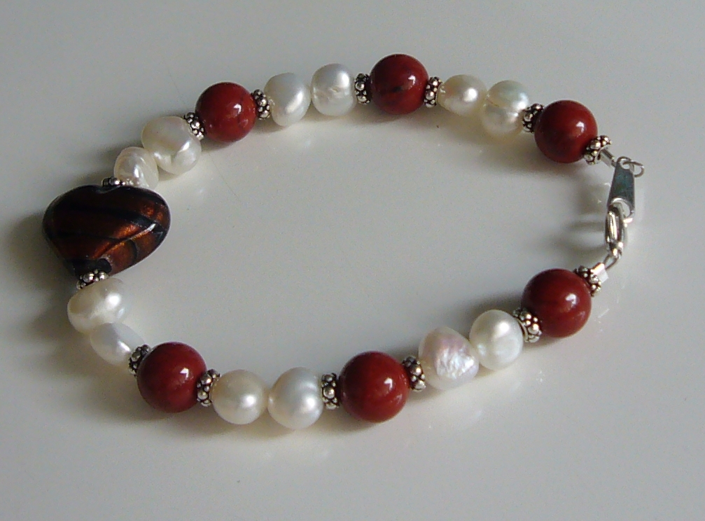 | Lonely heart: Makeanvedenhelmiä, jaspista, hopeoituja helmiä ja yksi lasisydän |